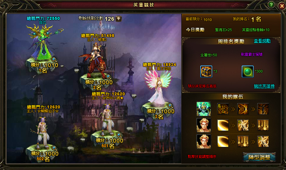 每週排名可以獲得凝神珠、英靈技能書等珍貴物品。排名靠前的更能獲得絢麗的稱